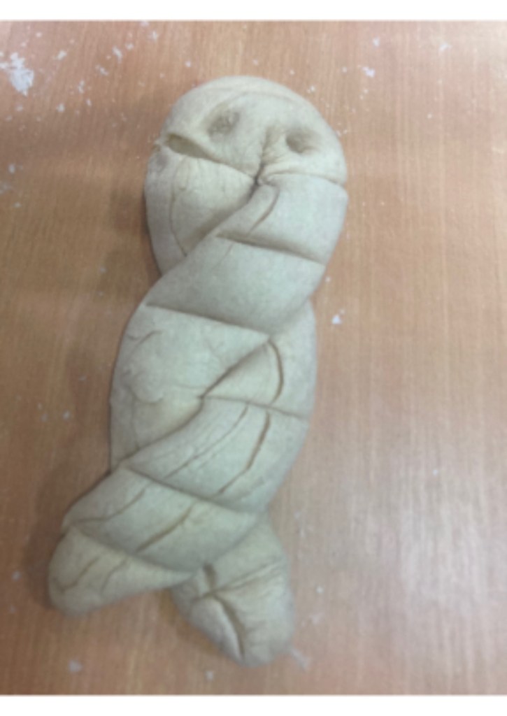 The next series of workshops were a bit more challenging but also rewarding. We went to the Gilfillan memorial church for four friday lunchtime meetings which cater for the homeless and socially deprived people. They come and have lunch and then we invited them upstairs to the workshops. The attendance was very limited but the folk that did turn up seemed to enjoy themselves. Below is ‘owl pig’ which a lovely lady made after a quiet start, she really started to embrace the dough. The snout in the middle of him is actually one of my wee bread men – they get everywhere!!