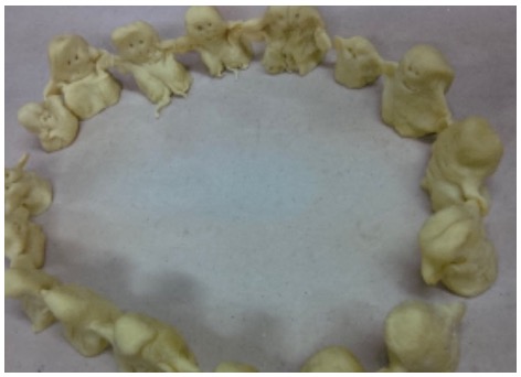 While doing my MA at Dundee University, I did some workshops with peers and in the community. First up two of my peers and I did an activity workshop day in the college for students. People popped in throughout the day and it was just very casual and laid back. It was interesting to see out of all the different students that made dough that day, the girl that was a sculpture student was so natural and uninhibited when she handled the dough in comparison to others who took a bit of time to get going.