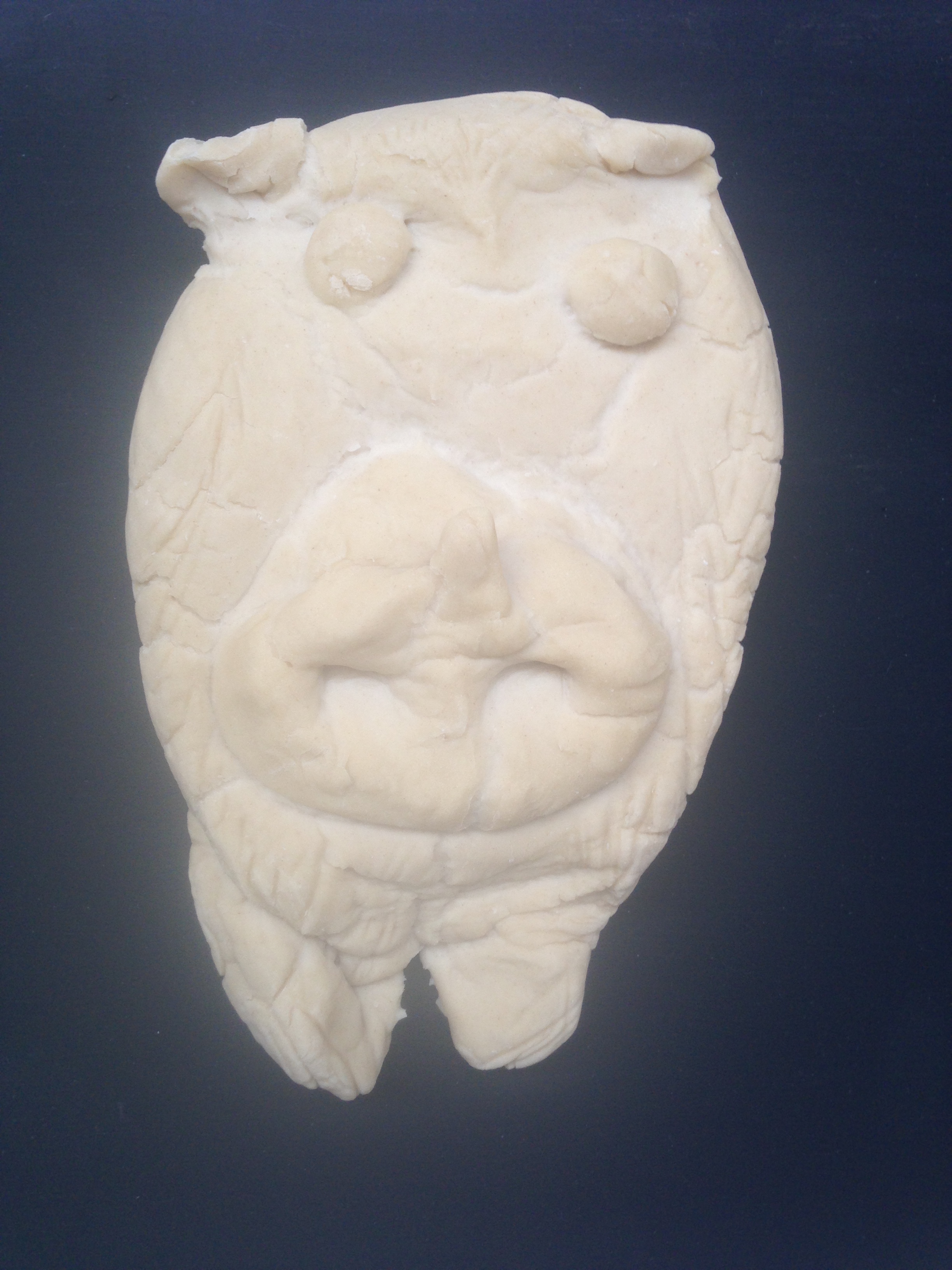 I had a one-to one dough making session with a Psychology student from the university. We set up a video camera to film just our hands. I also recorded our conversation and made a transcript of it. It was fascinating to watch what she did with the dough while we were have a meaningful conversation. There were times when she was pushing it away from herself, breaking it up into pieces, layering it, and at one point she held it down very firmly with one hand and picked wee bits off with the other. She made one little dough shape, like a little snake, which felt fairly contrived but it was the other shape that was more interesting. While we were busy chatting , her fingers were digging into the dough, it was like she was exerting her authority, making her mark. In her feedback, she said she felt it was a worthwhile and therapeutic experience. It was like ‘fiddling with permission’ and a great outlet for expression and a physical experience at a basic level.